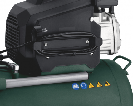 » Alles verstaut: Aufnahmen für den Druckluftschlauch und für zwei Druckluftwerkzeuge, Steckplätze für Kleinzubehör und praktische Kabelaufwicklung am Kompressor